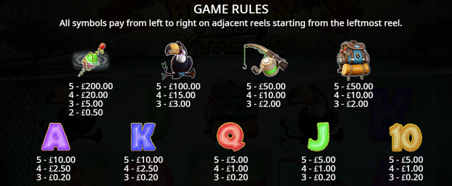 Aside from standard playing card symbols, fishing symbols like the fishing rod and backpack and the Amazonian toucan offer impressive payouts. Check out the paytable below for winning combos: